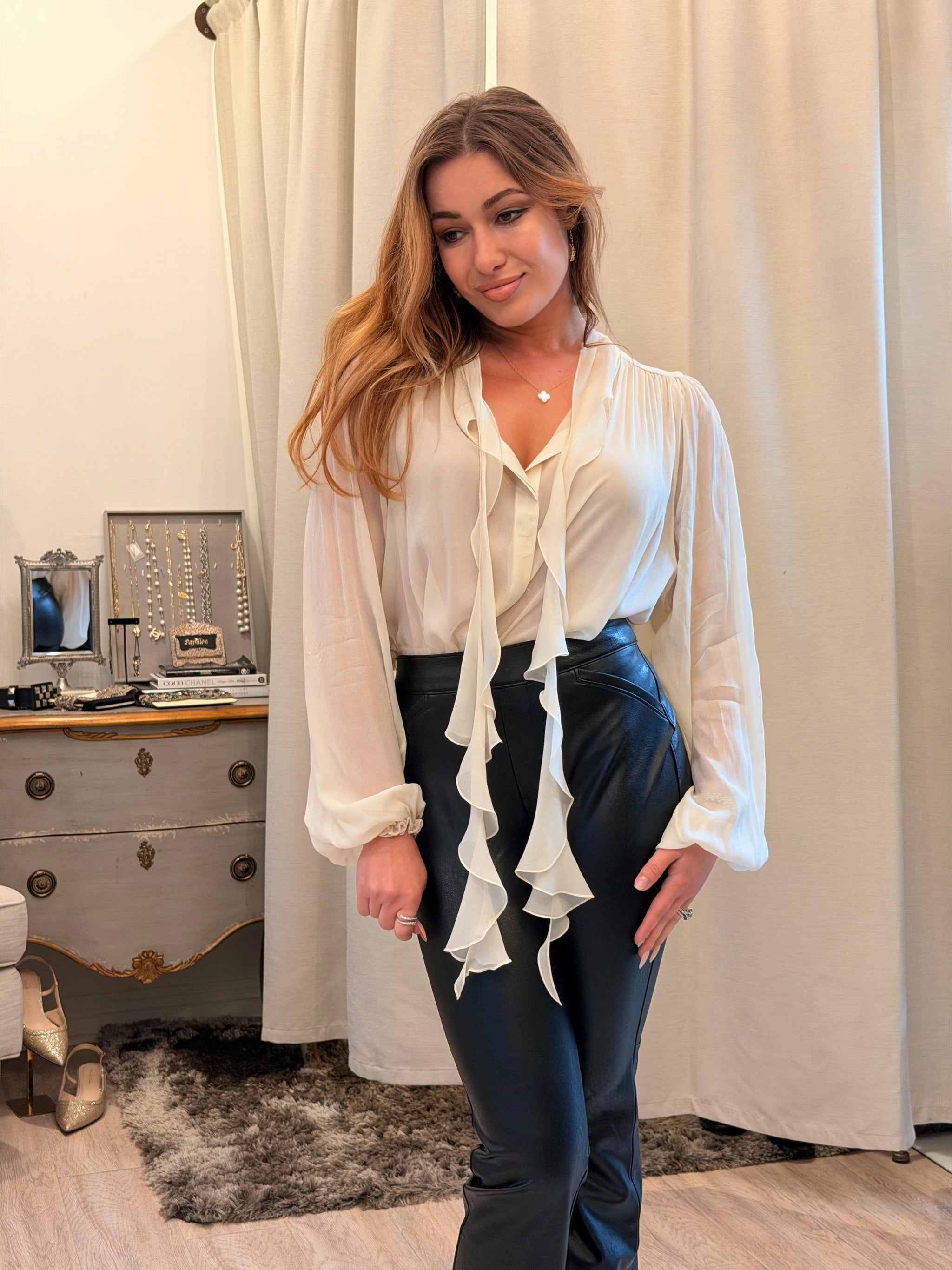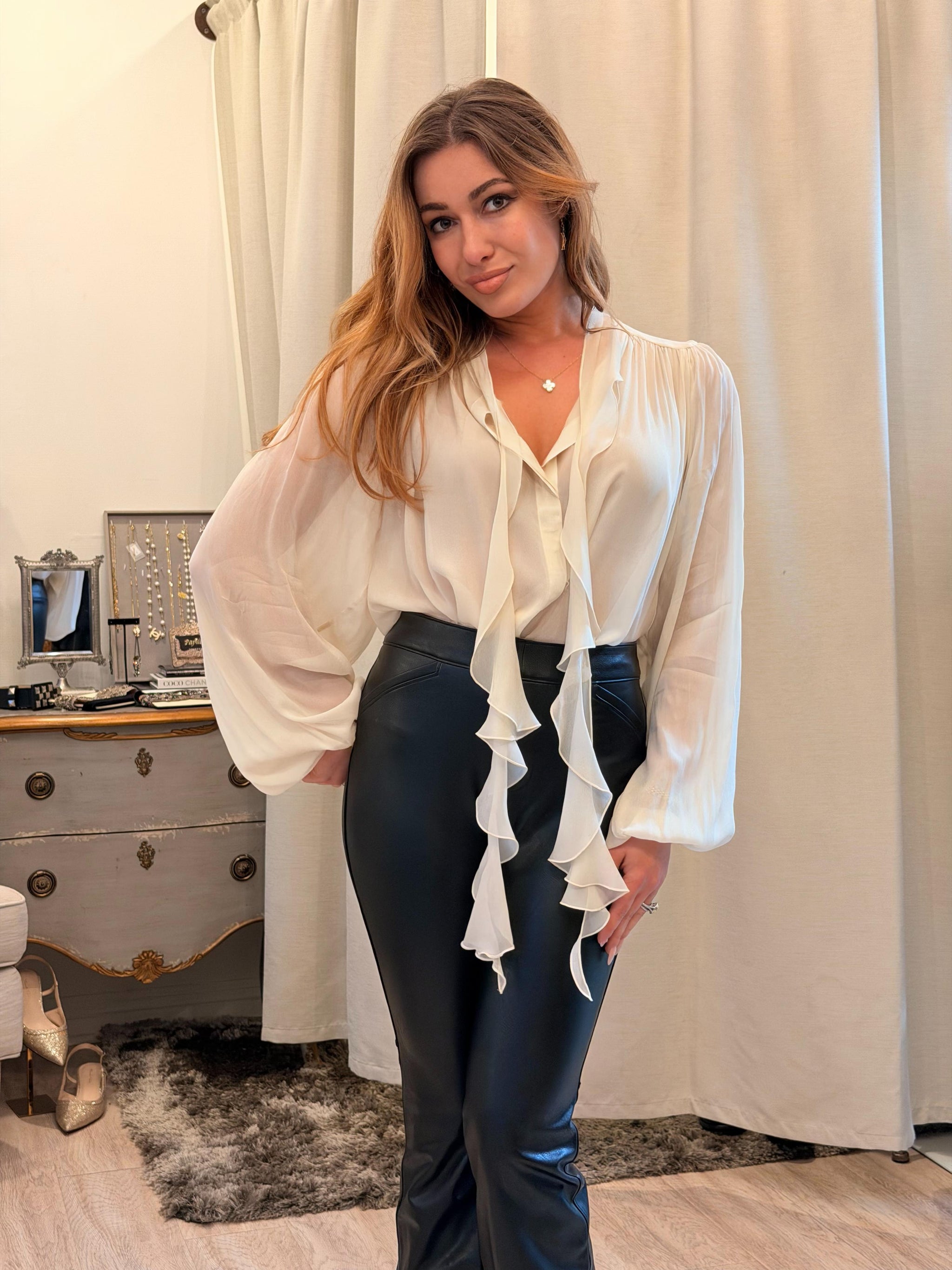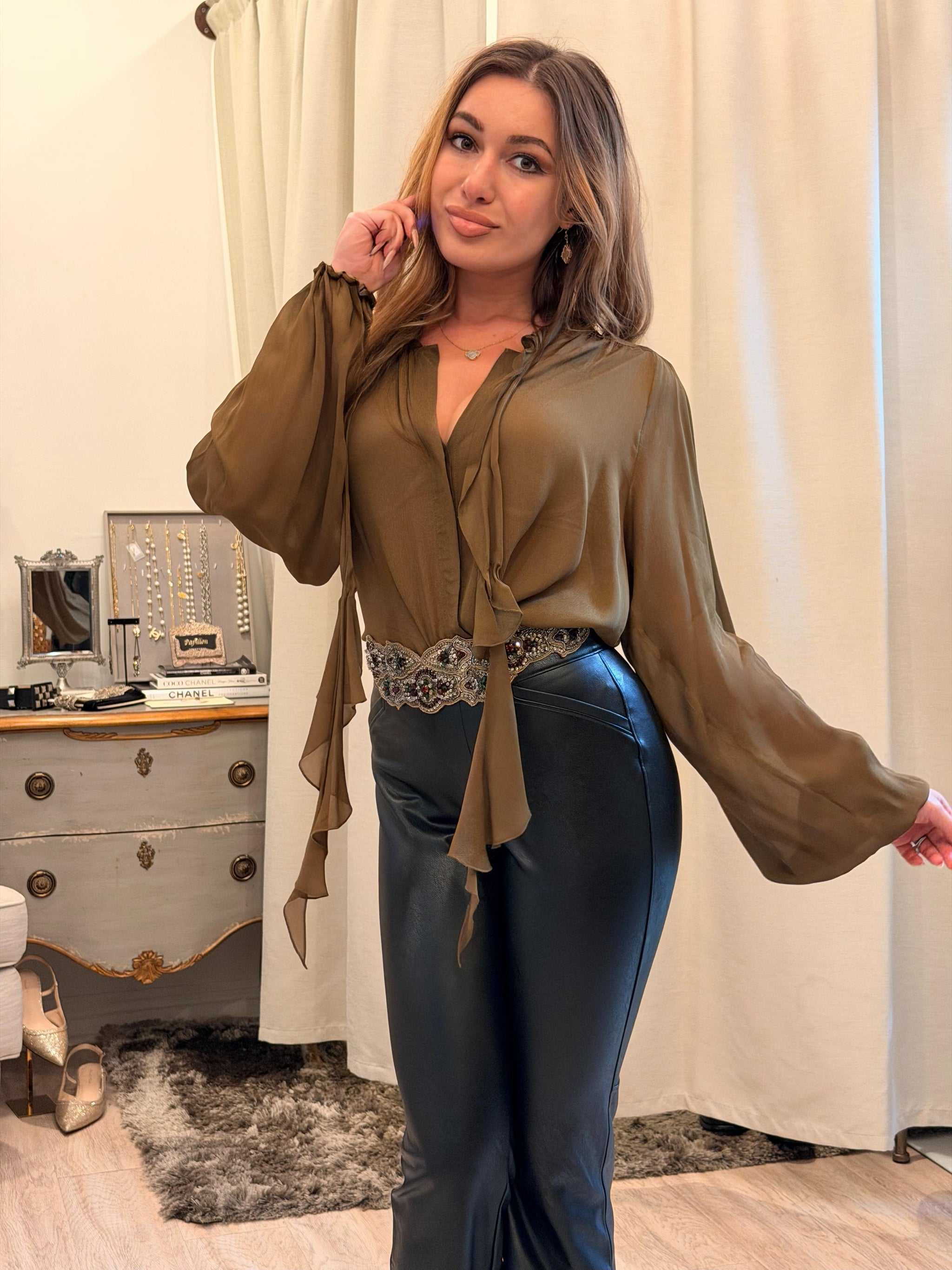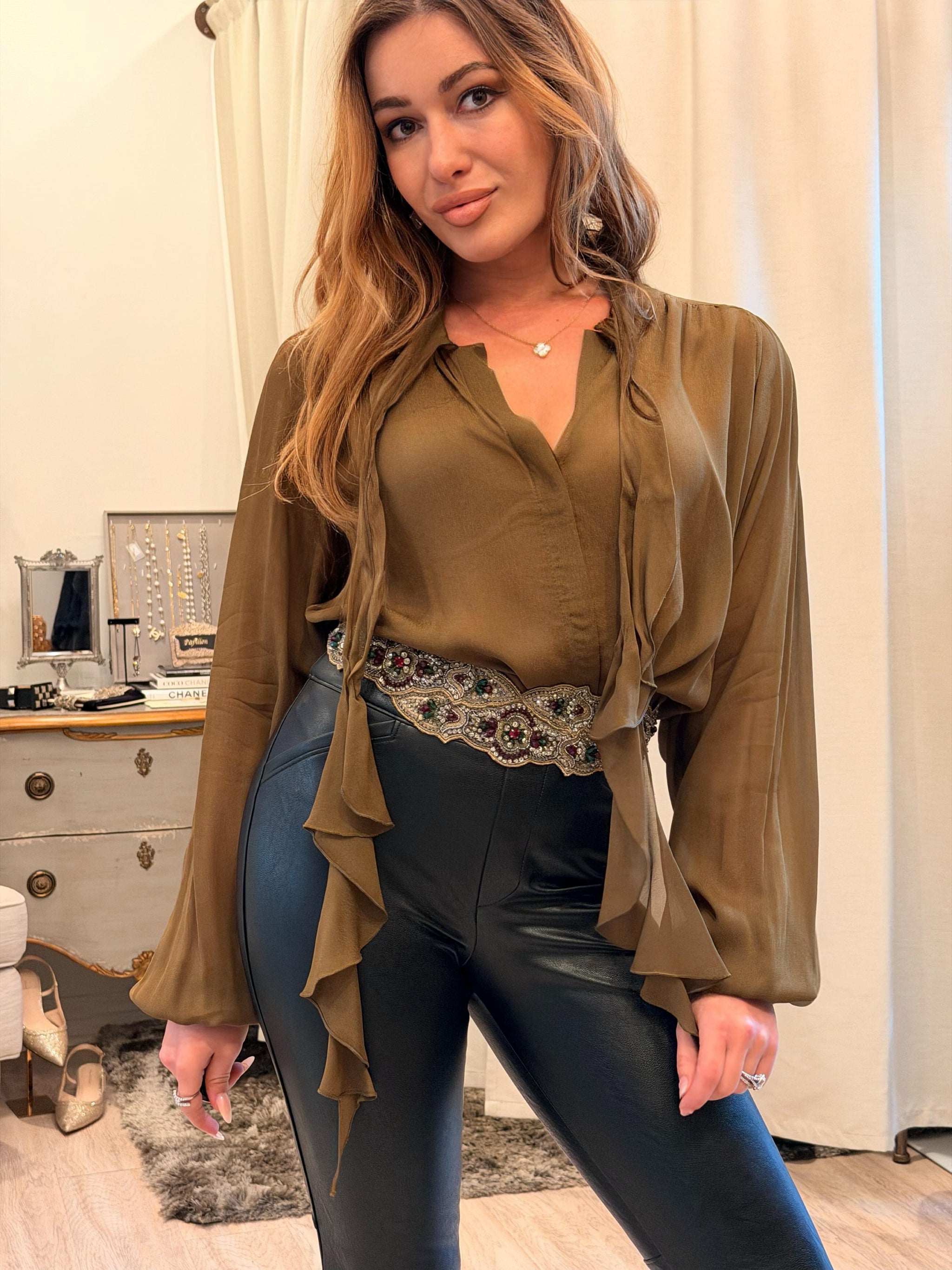 T.ba Pienza Blouse Crespon Crepe Pienza Blouse A blouse grounded in earthy tones and gentle movement. With flowing sleeves and cascading ruffles, it drapes effortlessly, offering...