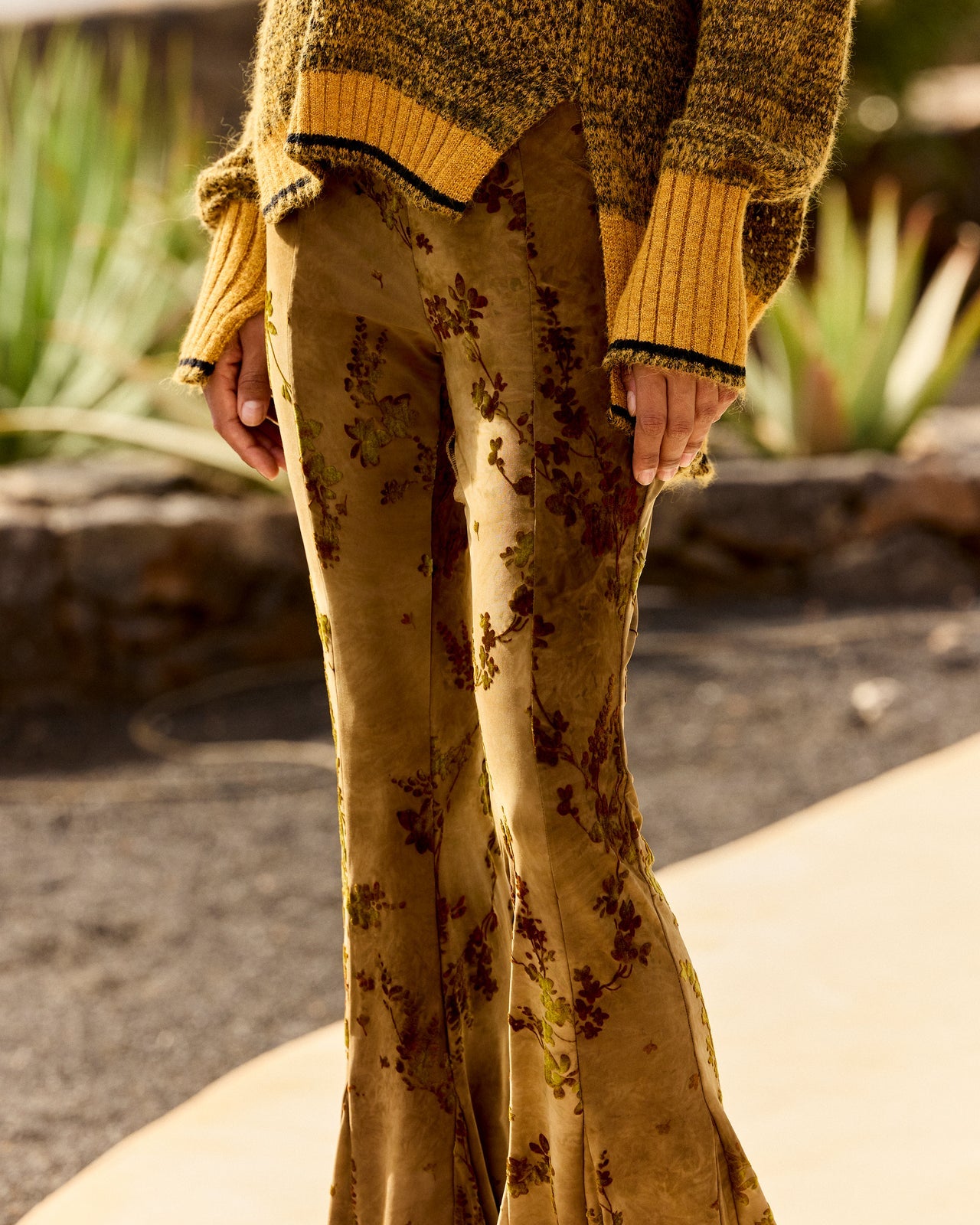 Mes Demoiselles Sand Colored Trousers Soft, flowing jersey trousers, enhanced by a velvet flocking that forms a delicate botanical motif in a palette of bronze...
