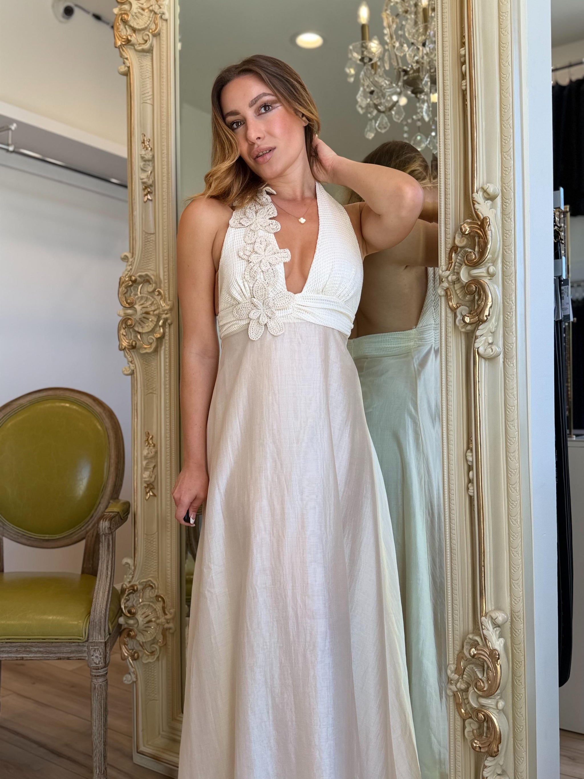 PHO Firenze Long Dress With Flowers Lined Dress Long Dress Open Front V Neck Dress Made In Italy