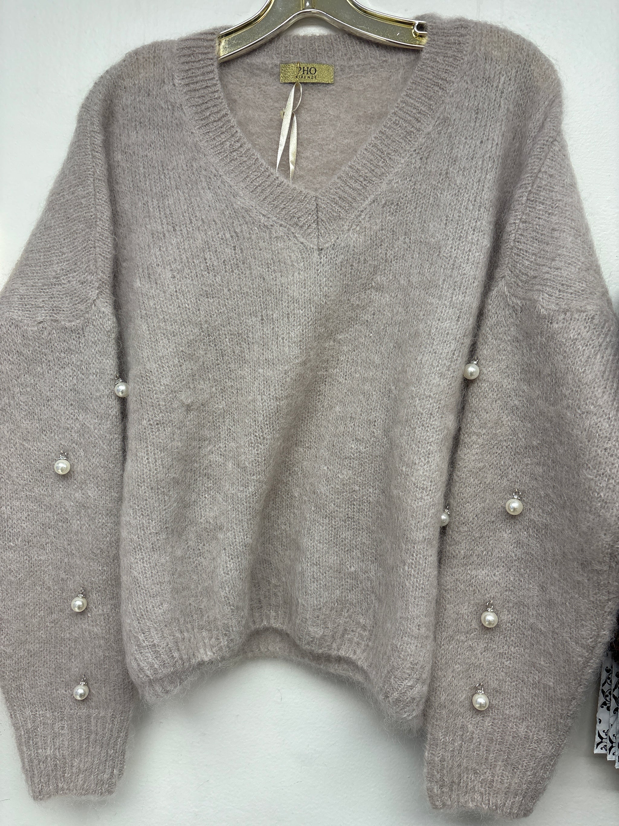 Knitted design Regular fit V-neck Long sleeves Pearl appliques Made in Italy 37% Polyamide/ 30% Wool/ 30% Baby Alpaca/ 3% Elastomer