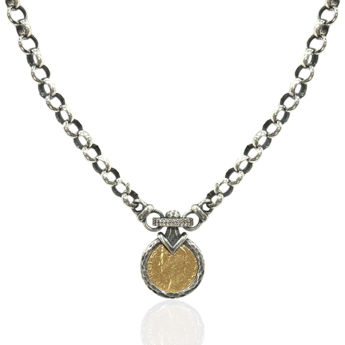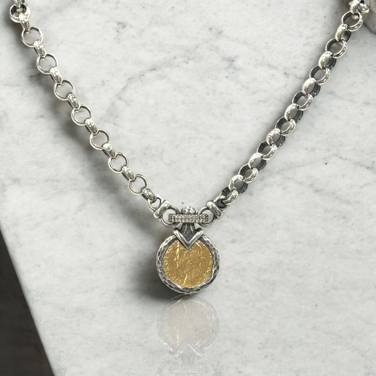 At the focal point sits a replica coin, elegantly bordered with shimmering cubic zirconia to inject just the right amount of sparkle. On each side of coin custom-cut labradorite cabochons dazzles with signature iridescence.