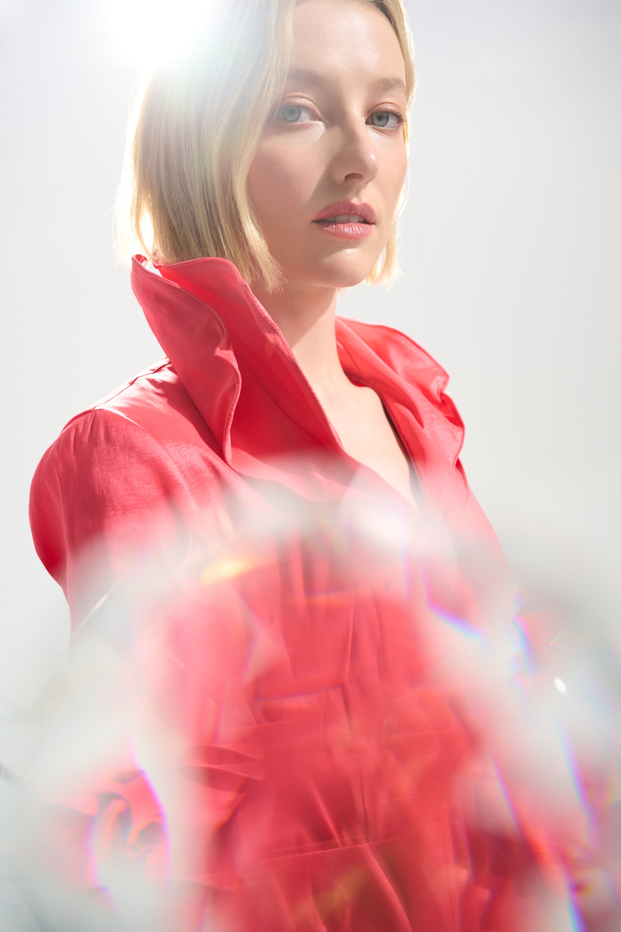 Sculpted yet fluid, this stretch taffeta dress features a wired double lapel collar, waist sash, and pleated skirt. The Rhinestones zipper pull adds a refined...