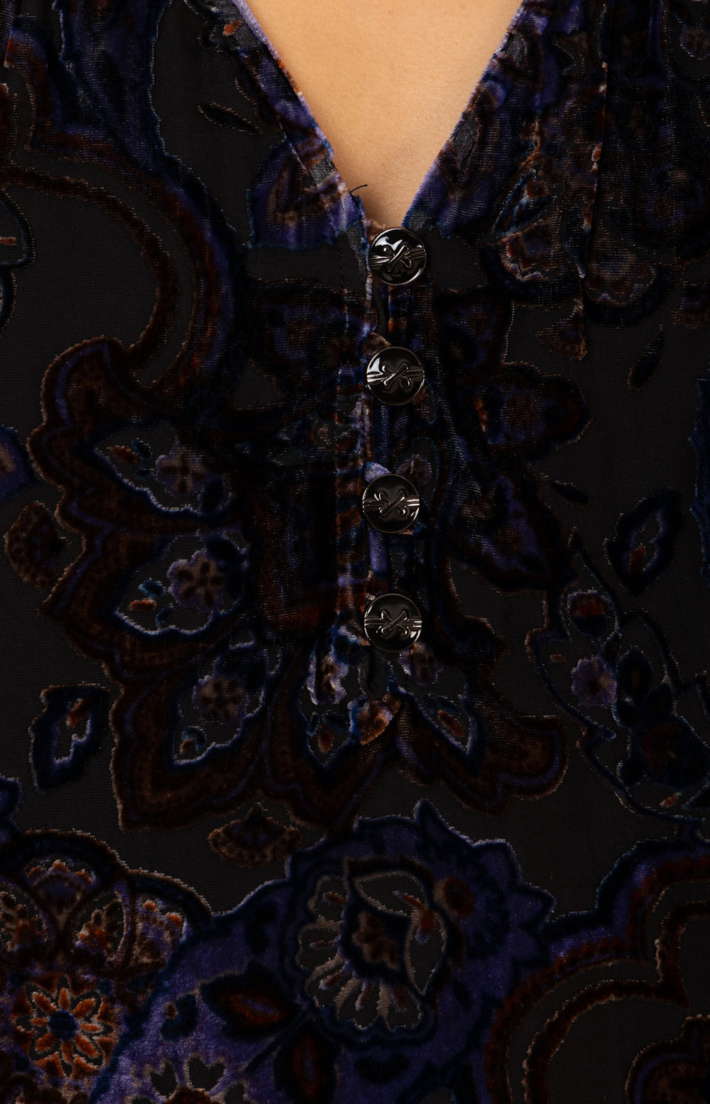 Hale Bob Elyse Velvet Top Velvet Burnout Set in jersey lining at body Pleating at top neck & sleeve Buttons at front keyhole (60% silk/40%...