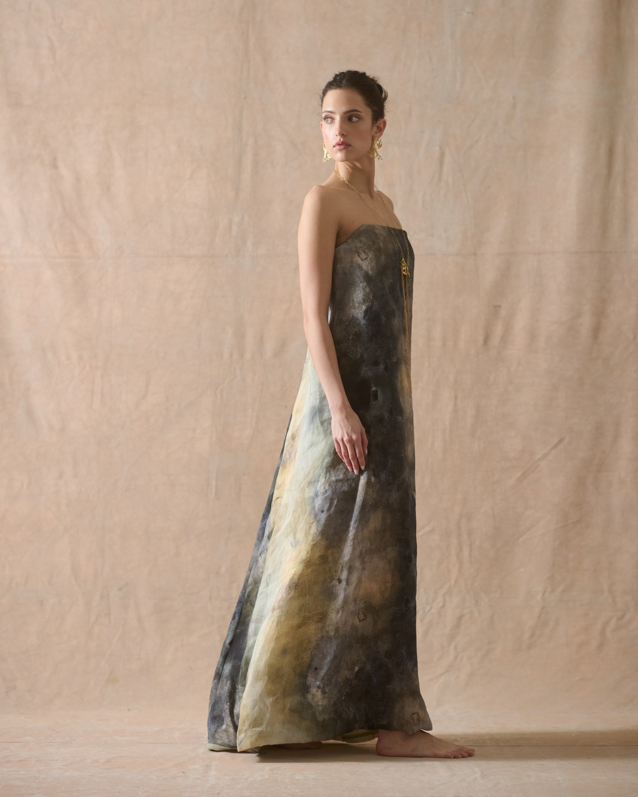 Maxi dress in fine crepe with an asymmetric neckline and slim straps. Draped layers and cascading panels create fluid movement and a soft, elongated silhouette.
