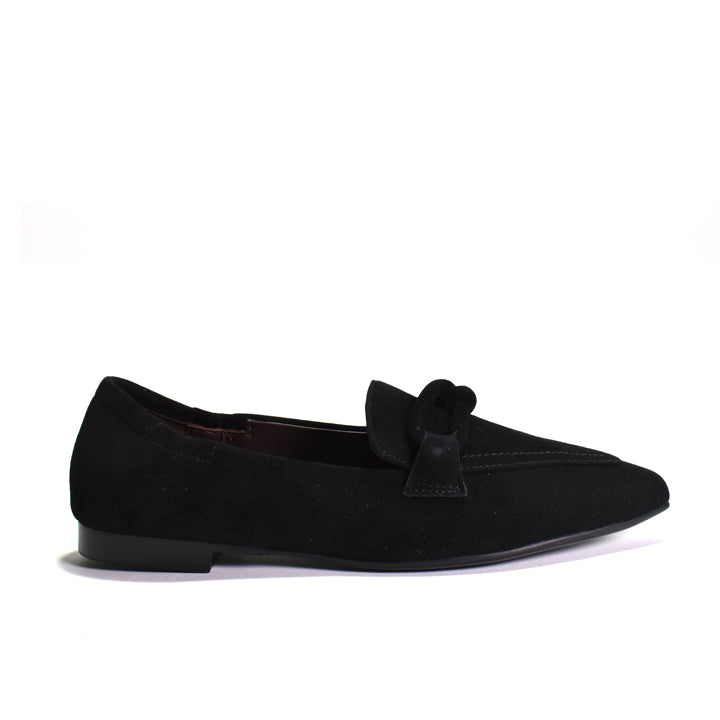 Cordani Miriam Flat Pointed Loafer Flat pointed loafer made using the ever-so-comfortable sacchetto construction. Suede upper with suede chain buckle and elasticized back for secure...