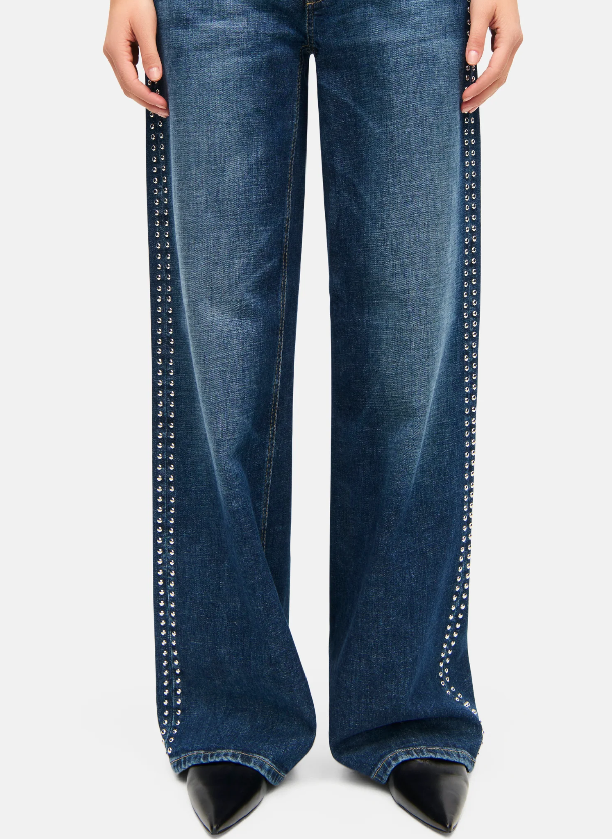 High Rise Rhinestone Detail Slim Wide Jeans Aileeah Comfort Stretch Denim, HIGH RISE WAIST, RHINESTONE DETAIL, FULL LENGTH, SLIM WIDE JEANS F. RISE: 10" / INSEAM: 30" / LEG OPENING: 17 1/2" MODEL IS 5'10" WEARING SIZE 26